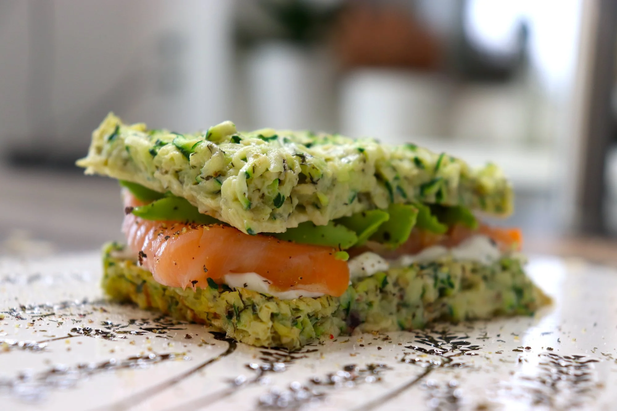 Preparando sandwich de pan de calabacín con salmón ahumado y aguacate…