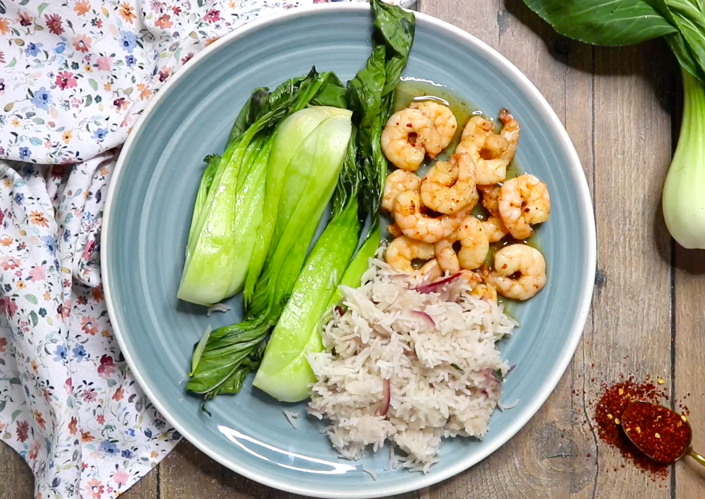 GAMBITAS ORIENTALES CON PAK CHOI Y SALSA DE CHILI