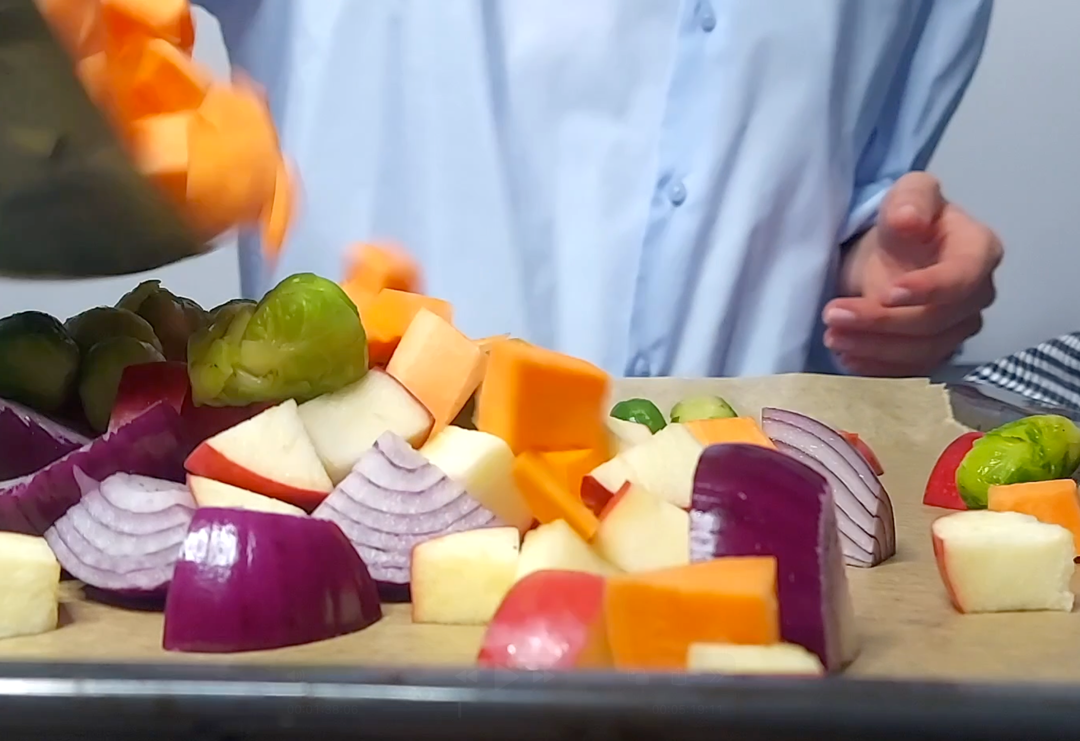 Cortar la batata y la manzana en cubitos, las coles de Bruselas por la mitad y la cebolla en octavos, y disponer en una bandeja de horno con papel sulfurizado. Condimentar con sal y pimienta y el resto del aceite de oliva.