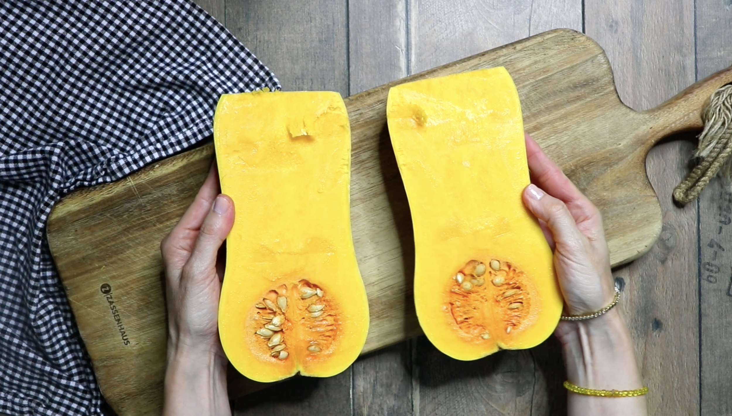 Partir la calabaza por la mitad y extraer las semillas y disponer en una bandeja de horno con papel sulfurizado junto a los tomates, las cebollas (peladas) y la cabeza de ajos.