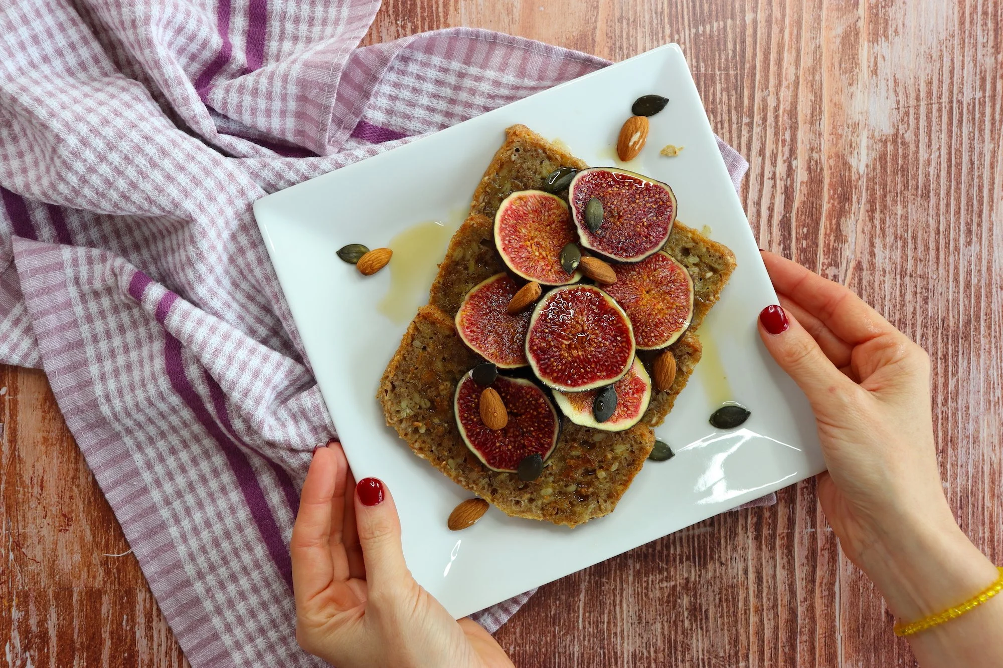 Decorar con sirope de arce, higos frescos, un hilito de yogur de coco, tomillo fresco y almendras laminadas